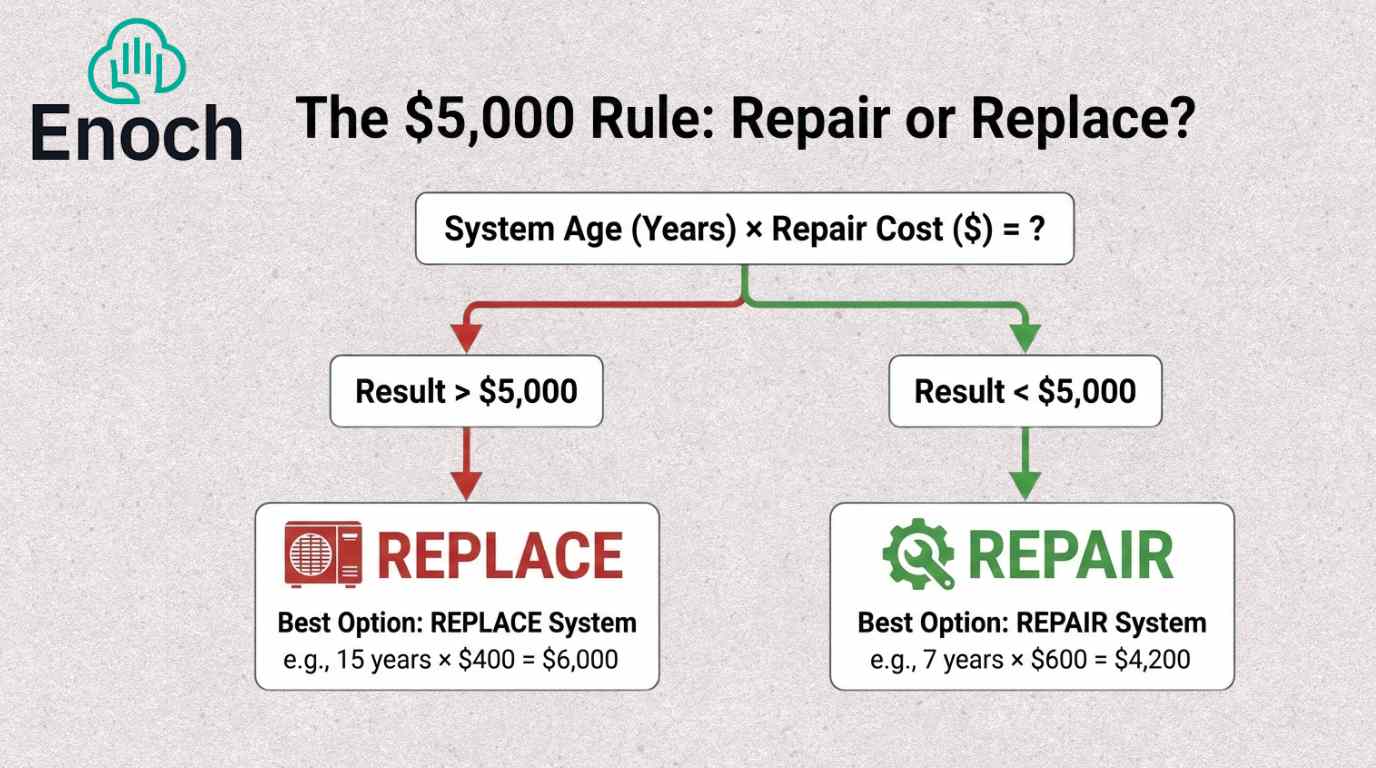 The $5,000 rule helps determine whether to repair or replace your HVAC system. Multiply your system's age by the repair cost. If the result exceeds $5,000, replacement is typically more cost-effective.